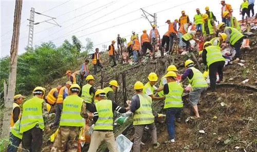 受连日降雨影响,8月16日,西(安)平(凉)铁路乾县段漠西区间路基边坡发生滑坡,影响行车安全。图为中铁电气化局铁路工程公司突击队正在对西平铁路抢险加固。 秦发睿摄