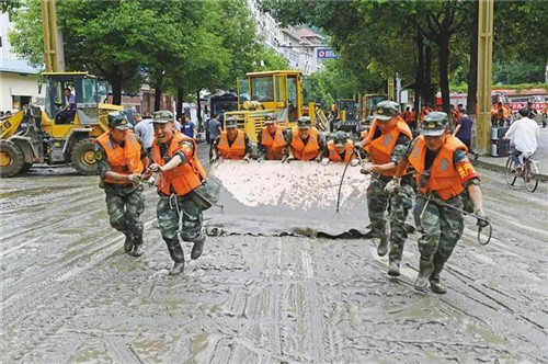 8月17日,洪水过后,武警官兵在略阳县城临江低洼区域清理淤泥。高振博摄