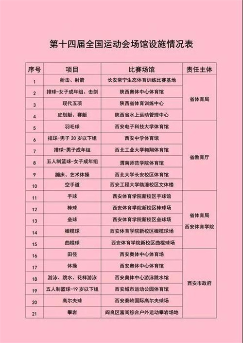 2015年12月29日,国务院办公厅同意陕西省承办2021年第十四届全国运动会,依据《中华人民共和国第十四届全国运动会竞赛规则总则》,十四运会共设置34个大项,387个小项。