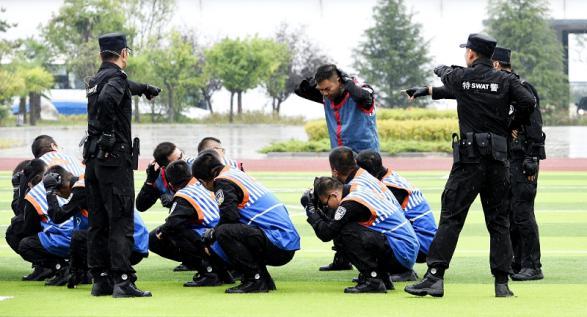演练现场,面对发生的“骚乱”,立即启动了应急响应预案,联勤小组1分钟之内到达了现场,并“一”字队形向前推进进行警告。特警队随后到达。此时有3名“罪犯”不听劝告,继续煽动他犯骚乱闹事,特警队员立即使用标记枪进行三名罪犯的识别标记,并迅速配合联勤小组对三名带头罪犯准确进行抓捕。