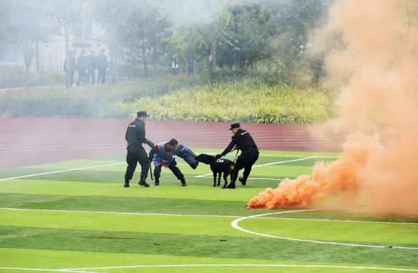 说时迟那时快,现场管理警察第一时间将其他“罪犯”带离骚乱区域。特警队员果断采取强制措施,投掷了震爆弹和烟幕弹,随着“嘭”“嘭”的几声巨响,烟雾四起,特警队员在这些的掩护下,迅速对四名“罪犯”实施抓捕,同时使用电击枪击倒“主犯”。剩余两名“同犯”见机逃跑,两只警犬闻令而动,帮助特警机动组围追堵截,将“同犯”抓获。
