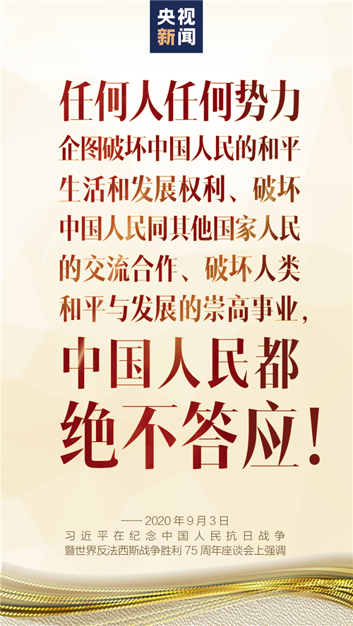 任何人任何势力企图破坏中国人民的和平生活和发展权利、破坏中国人民同其他国家人民的交流合作、破坏人类和平与发展的崇高事业,中国人民都绝不答应!