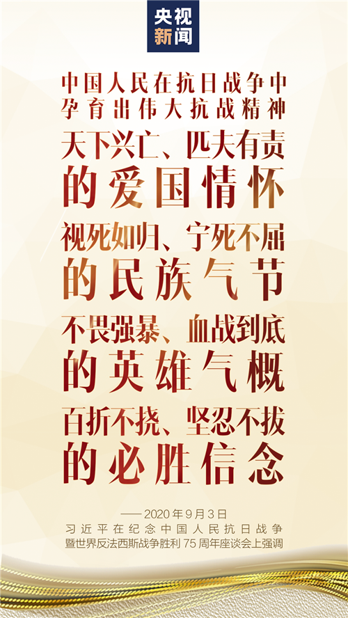 中国人民在抗日战争的壮阔进程中孕育出伟大抗战精神,向世界展示了天下兴亡、匹夫有责的爱国情怀,视死如归、宁死不屈的民族气节,不畏强暴、血战到底的英雄气概,百折不挠、坚忍不拔的必胜信念。伟大抗战精神,是中国人民弥足珍贵的精神财富,将永远激励中国人民克服一切艰难险阻、为实现中华民族伟大复兴而奋斗。