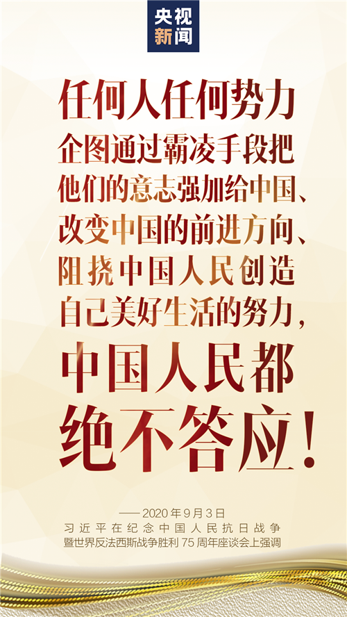 任何人任何势力企图通过霸凌手段把他们的意志强加给中国、改变中国的前进方向、阻挠中国人民创造自己美好生活的努力,中国人民都绝不答应!