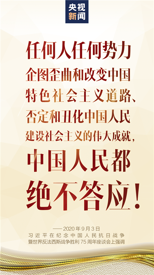 任何人任何势力企图歪曲和改变中国特色社会主义道路、否定和丑化中国人民建设社会主义的伟大成就,中国人民都绝不答应!