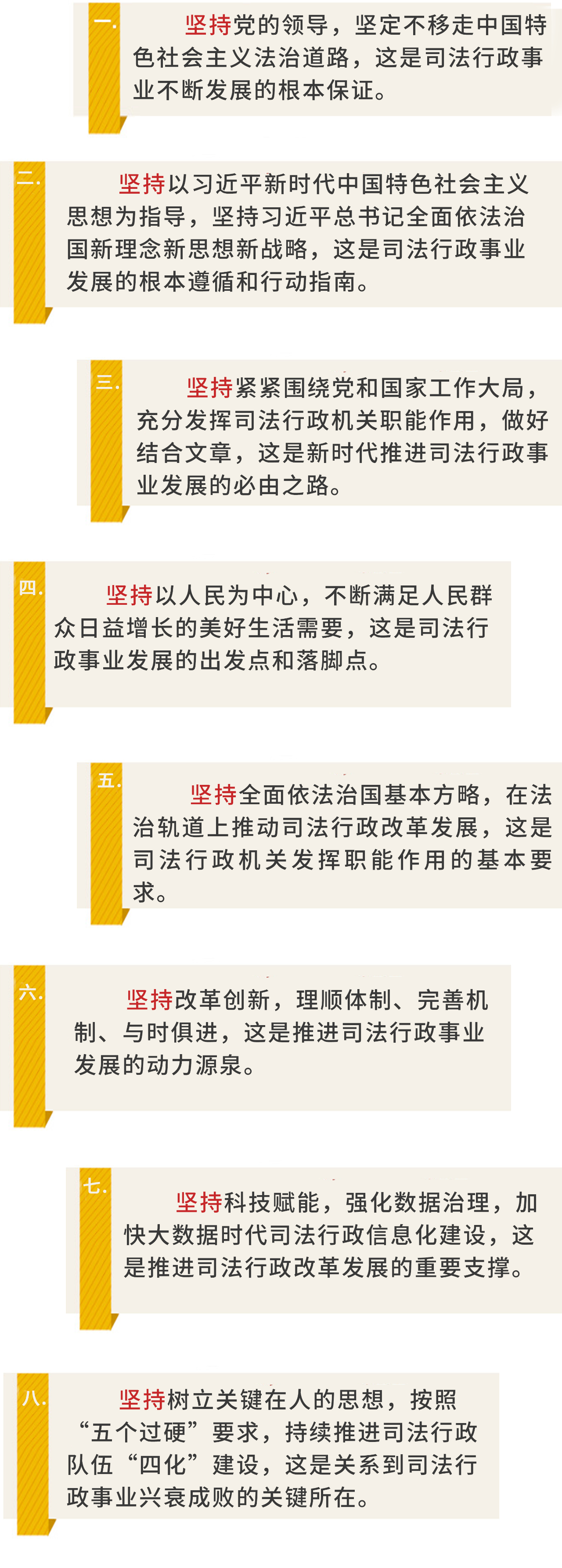 回顾改革开放40年来司法行政工作的发展实践和司法行政制度的历史演变,做好司法行政工作,我们必须着力做到八个方面: