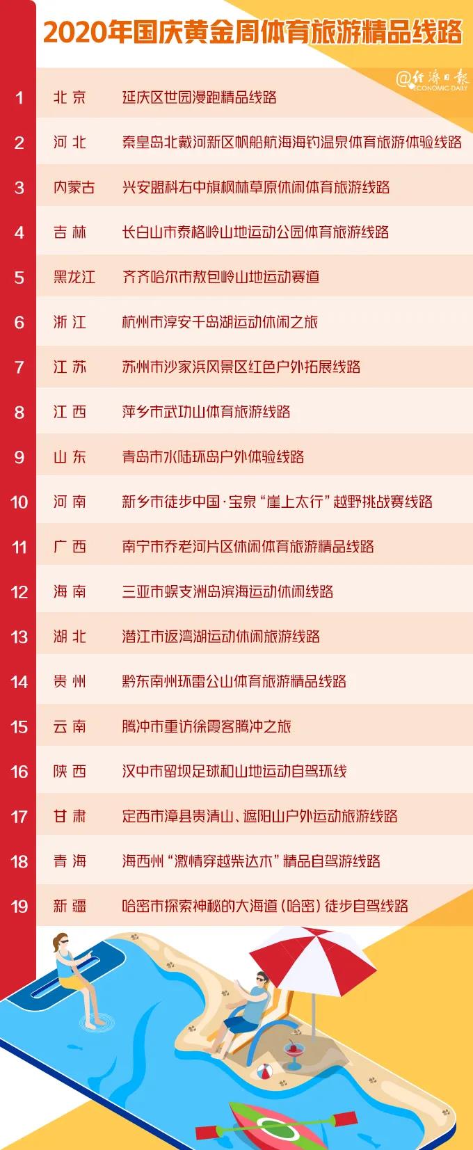 除了门票优惠,相关部门还为即将到来的黄金周推出了19条体育旅游精品线路,让运动爱好者一边健身休闲,一边欣赏沿途风光。