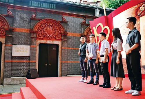 2020年6月29日,“新时代答卷人——上海市教育系统庆祝中国共产党成立99周年暨学生爱国主义教育主题活动”在中共一大会址前举行。来自复旦大学、同济大学、上海建桥学院、上海市曹杨第二中学等8所学校的200余名师生代表参加活动,通过情景讲述、现场教学、集体朗诵等形式,庆祝中国共产党成立99周年,展现广大上海学子的爱国情、强国志。图为复旦大学师生代表在一大会址前展示情景教学。新华社记者 刘颖/摄