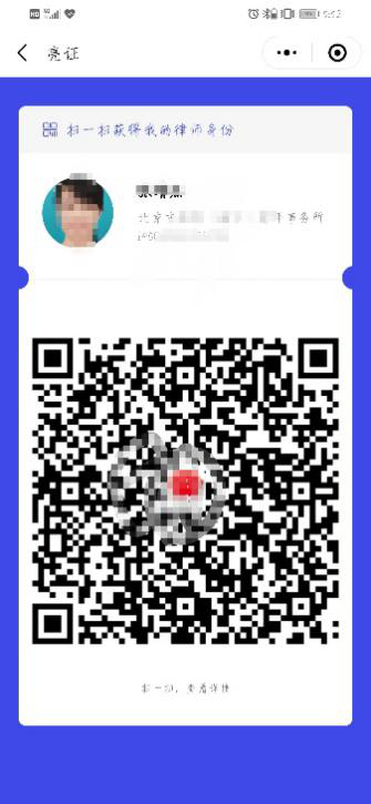 小程序中的律师电子执业证内包括律师姓名、执业机构、执业证号、年度考核、执业状态、律师照片等,该小程序依托全国律师综合管理信息系统建设,保持数据的同步更新。同时,相关部门也可以通过该小程序在线完成对律师身份信息的校验和核查。