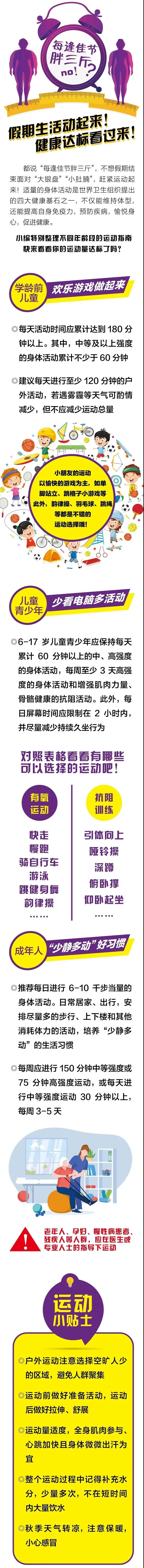 小长假进入第5天,你胖了没有?适量的身体活动是身体的健康基石之一,今天为大家整理了不同年龄段的运动指南↓↓快来学习吧!