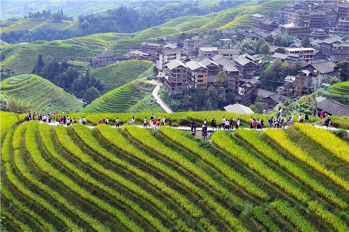 10月3日,游客在广西龙胜各族自治县龙脊梯田景区观光游玩。新华社发(吴生斌 摄)