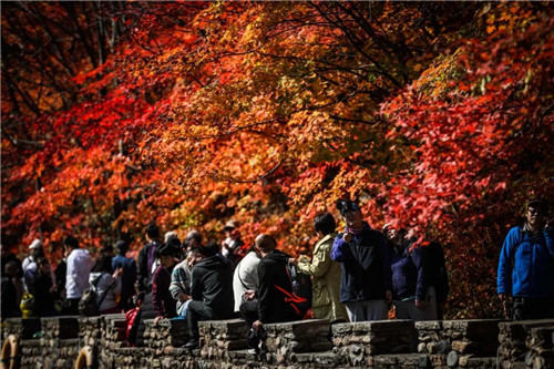 10月7日,游客在辽宁省本溪满族自治县大石湖风景区内游玩。新华社记者 潘昱龙 摄