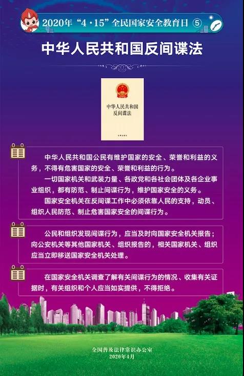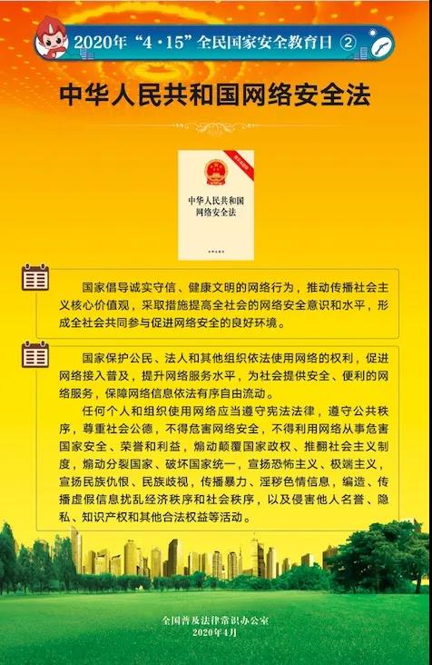 今年4月15日是第5个全民国家安全教育日。为提高全民国家安全法治意识,全国普法办组织编制了2020年全民国家安全教育日法治宣传挂图(一套6张),在智慧普法平台(中国普法网)发布,供各地各部门免费下载使用。
