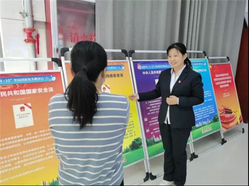 2020年4月15日,在范县司法局公共服务大厅,为前来办理业务的群众讲解国家安全法。