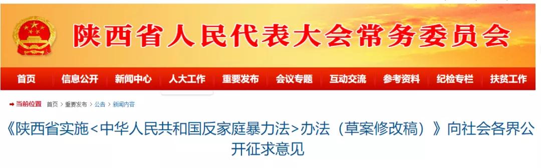 《陕西省实施<中华人民共和国反家庭暴力法>办法(草案修改稿)》已经省十三届人大常委会第十七次会议二审。为了进一步提高地方立法质量,促进立法的民主化、公开化,充分了解民情、反映民意,现将条例草案修改稿在省人大网站登出。敬请社会各界人士提出宝贵意见,有关修改意见建议请向省人大常委会法工委法规一处反馈。