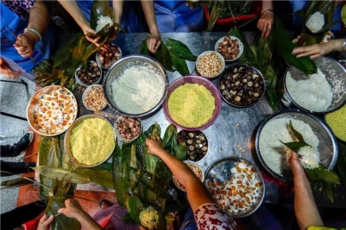 古人包粽子,甜者,还加入些许薄荷末,还有用艾叶浸米的,叫做艾香粽子。顾仲《养小录》记,粽子蒸熟后,可以剥出油煎,称油煎者为“仙人之食”。高濂在《遵生八笺》中则告诫:凡煮粽子,一定要用稻柴灰淋汁煮,也有用些许石灰煮者,为的是保持粽叶的青而香也。