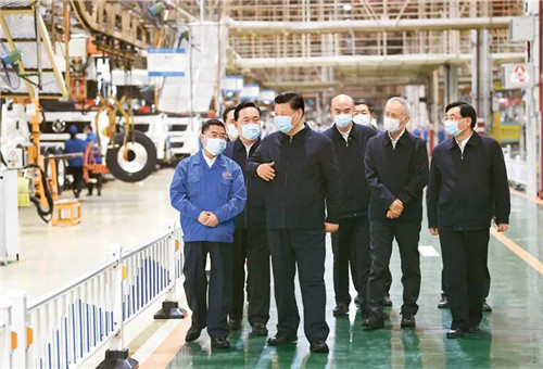 2020年4月20日至23日,中共中央总书记、国家主席、中央军委主席习近平在陕西考察。这是4月22日,习近平在陕西汽车控股集团有限公司总装车间察看生产线,了解产品研发、生产、销售和复工复产情况。新华社记者 谢环驰/摄