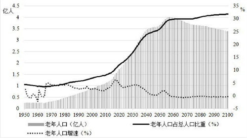 中国老年人口数量、比重和增速变化情况(1950—2100)