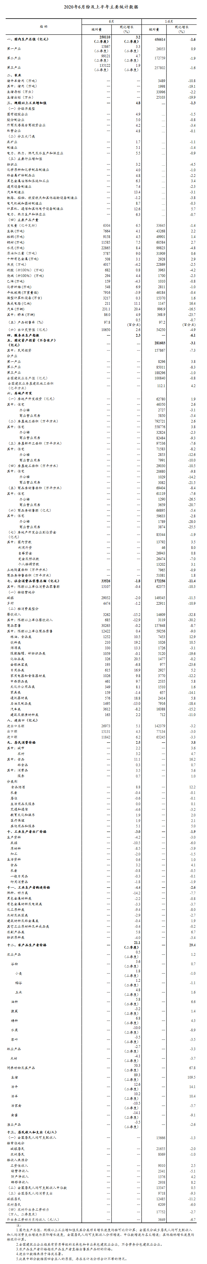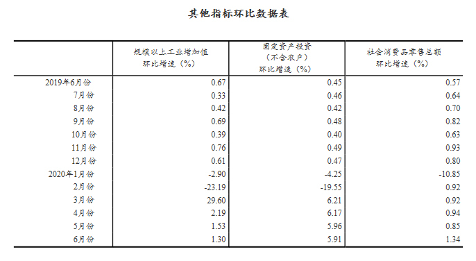 (2)根据季节调整模型自动修正结果,对近一年来各期国内生产总值、规模以上工业增加值、固定资产投资(不含农户)、社会消费品零售总额环比增速进行修订。修订结果及2020年二季度GDP环比数据、2020年6月份其他指标环比数据如下: