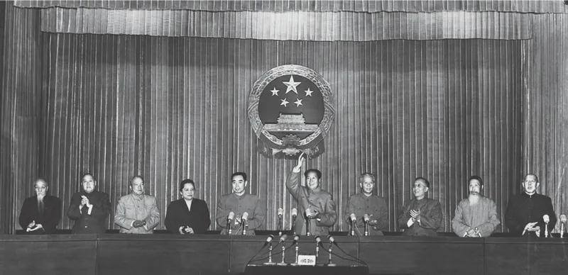 1954年9月15日至28日,第一届全国人民代表大会第一次会议在北京举行。刘少奇在关于宪法草案的报告中指出:中国共产党是我们国家的领导核心;中国共产党的党员必须在遵守宪法和一切其他法律中起模范作用。会议通过了第一部《中华人民共和国宪法》,这部宪法肯定了中国共产党领导中国人民走过的新民主主义革命道路,明确了中国共产党在人民民主统一战线中的领导地位。图为毛泽东等在会议闭幕式主席台。新华社发