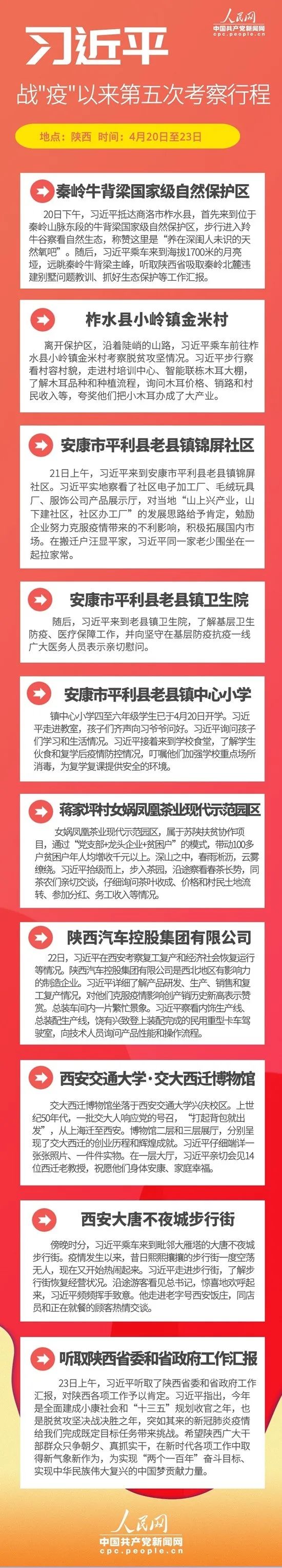 4月20日至23日,中共中央总书记、国家主席、中央军委主席习近平赴陕西商洛、安康、西安等地,深入自然保护区、贫困山区、社区、学校、企业等,了解秦岭生态环境保护、脱贫攻坚、复工复产等情况,就统筹推进新冠肺炎疫情防控和经济社会发展工作、打赢脱贫攻坚战进行调研,看望慰问干部群众。