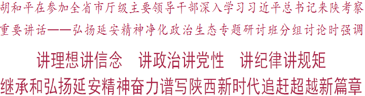 胡和平说,延安精神是我们党的宝贵精神财富。继承和弘扬延安精神,要讲理想、讲信念,坚持用习近平新时代中国特色社会主义思想这一当代中国马克思主义、21世纪马克思主义武装头脑,深刻感悟“革命理想高于天”的永不动摇信仰红线,坚定政治信仰、牢记初心使命,真学真懂、真信真用,做党的创新理论的坚定信仰者和忠实实践者。要讲政治、讲党性,增强“四个意识”、坚定“四个自信”、做到“两个维护”,对国之大者心中有数,不折不扣落实好习近平总书记重要指示批示和党中央决策部署,落实好奋力谱写陕西新时代追赶超越新篇章总体目标和推动经济高质量发展迈出更大步伐、打造内陆改革开放高地、推动生态环境质量持续好转、加强民生保障和社会建设、推动全面从严治党向纵深发展等五项要求。要讲纪律、讲规矩,始终挺纪在前,严明党的政治纪律和政治规矩,坚决破除形式主义、官僚主义,巩固和发展反腐败斗争压倒性胜利。要坚决全面彻底肃清赵正永流毒和恶劣影响,扎实做好以案促改工作,努力营造全省风清气正的政治生态。