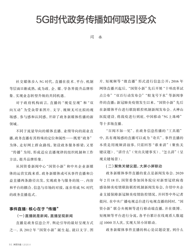 从国资委新闻中心“国资小新”和中央企业新媒体的运营实践来看,政务新媒体或可从事件直播和公益直播两条路径出发,实现政务与服务的统一、内容和平台的耦合、信息与市场的对接,逐步形成 5G 时代的政务直播范式。
