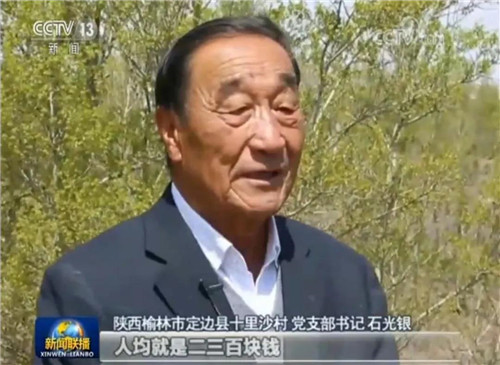 陕西榆林市定边县十里沙村党支部书记 石光银:过去我们这的收入人均就是二三百块钱,现在人均三万多块钱,为何呢?这就是生态环境的一个好处,这社会效益也有了,生态效益也好了。