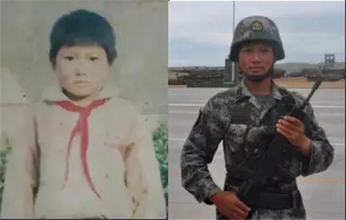 2003年,二年级入学不久,戴着红领巾站在国旗下。2017年7月30日,在朱日和训练基地,作为一名列兵参加完建军90周年阅兵仪式,正准备有序撤离。