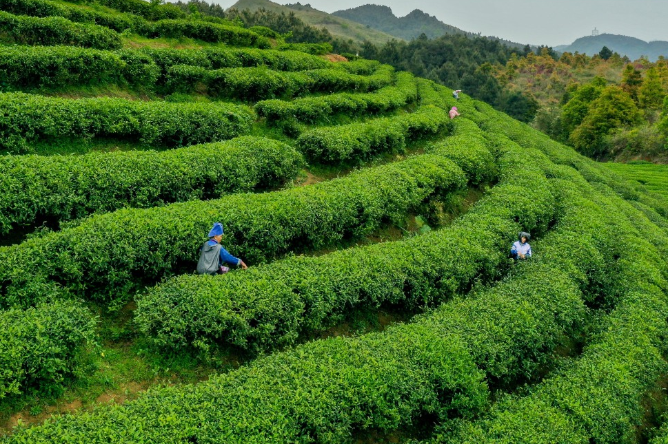 资料图:4月25日,茶农在贵州省黔东南苗族侗族自治州丹寨县“扶贫茶园”内采茶(无人机照片)。新华社记者 欧东衢 摄