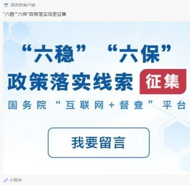 为深入贯彻十三届全国人大三次会议精神,认真落实党中央、国务院关于统筹推进疫情防控和经济社会发展的重大决策部署,推动政府及其部门在疫情防控常态化前提下,扎实做好“六稳”工作,全面落实“六保”任务,确保完成《政府工作报告》提出的经济社会发展目标任务,国务院“互联网+督查”平台从即日起面向社会征集关于“六稳”“六保”政策措施落实的问题线索和意见建议。一是市场主体特别是中小微企业和个体工商户在复工复产、复市复业和享受落实支持企业纾困发展政策措施等方面遇到的困难和问题;二是人民群众在就业创业和享受落实基本民生保障政策措施等方面遇到的困难和问题;三是根据形势变化,需要国务院及其有关部门及时调整完善政策措施、加强和改进工作的意见建议;四是有关地方和部门在工作落实中不担当、不作为、不会为、任意决策、任性执法、推诿扯皮、敷衍塞责以及存在形式主义、官僚主义等问题线索。