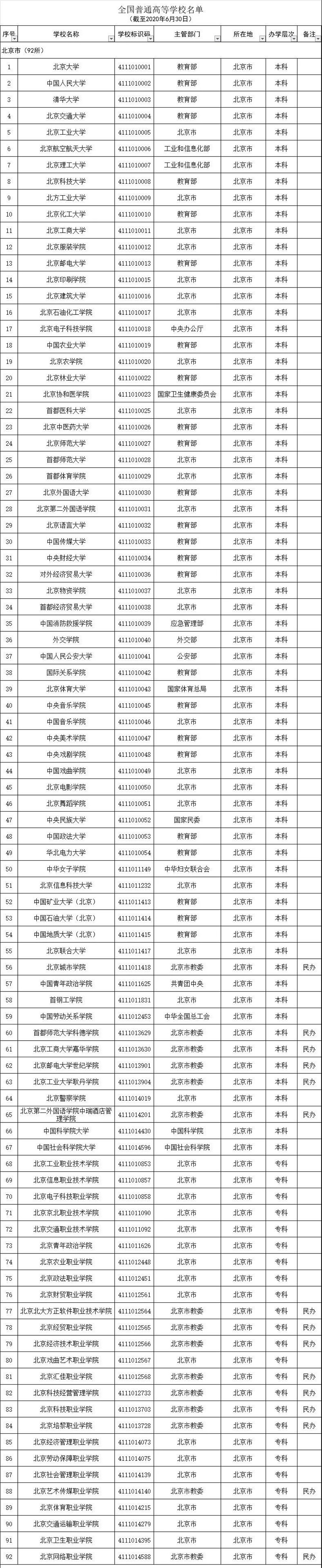 截至2020年6月30日,全国高等学校共计3005所。其中:普通高等学校2740所,含本科院校1258所、高职(专科)院校1482所;成人高等学校265所。